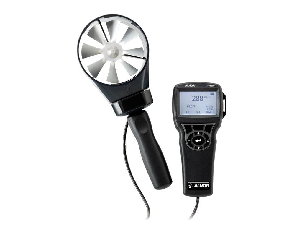 Es un anemómetro digital portátil de paletas giratorias que mide la velocidad, el volumen y la temperatura del aire en unidades anglosajonas o métricas. El gran cabezal de cuatro pulgadas (100 mm) promedia automáticamente las lecturas de velocidad y volumen, lo que convierte al RVA501 en una herramienta esencial para medir flujos distribuidos o fluctuantes a través de serpentinas de calefacción y enfriamiento, difusores, rejillas y filtros, con la mejor exactitud y resolución encontrados en este tipo de instrumentos, incluso a bajas velocidades de aire.